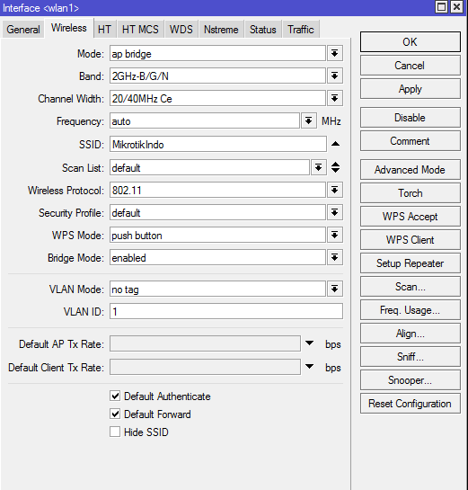 4. Aktifkan (enable) interface wlan1 (wireless) nya. Masuk ke menu wlan1 nya, silakan setting mode AP Bridge --> SSID : isikan nama sinyal Wireless nya (SSID) --> pilih frekuensi yang diinginkan --> selebihnya silakan setting sendiri sesuai kebutuhan --> OK